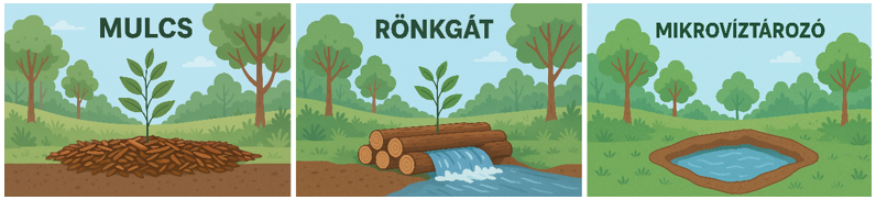 - Kis kapacitású vízvisszatartó tavak, árkok, erdei mélyedések helyreállítása.
