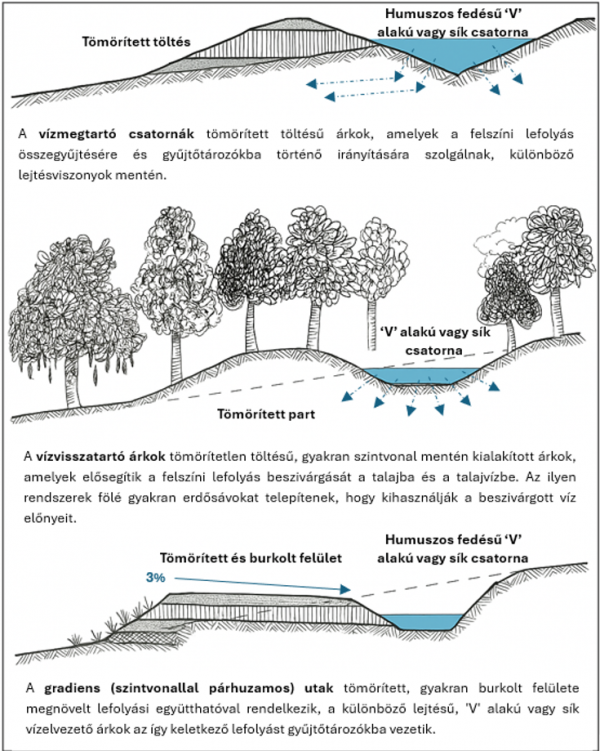 Helyi vízvisszatartási megoldások (Darren J. Doherty, Andrew Jeeves, Georgi Pavlov: The Regrarians Handbook nyomán)